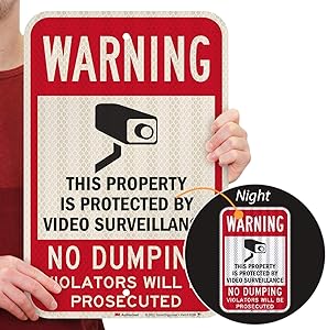- WARNING SIGN – Let everyone know about your Security or Video Surveillance Cameras. Let unwelcome trespassers know that they will be recorded on camera and violators will be prosecuted. It’s just another level of protection for your house or business. This signs says, “Warning No Dumping 24 HR Video Surveillance Violators Will Be Prosecuted”.
